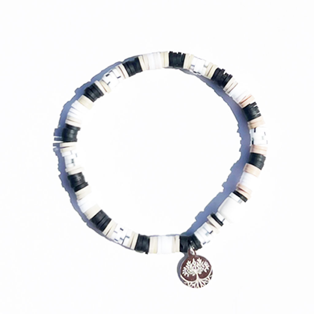 Bracelet élastique, modèle mixte Homme/Femme composé de perles rondelles heishi et d’une plaque « arbre de vie » en acier inoxydable.