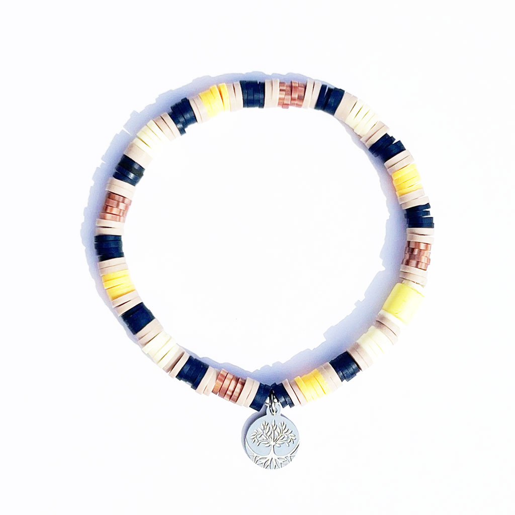 Bracelet élastique, modèle mixte Homme/Femme composé de perles rondelles heishi et d’une plaque « arbre de vie » en acier inoxydable.