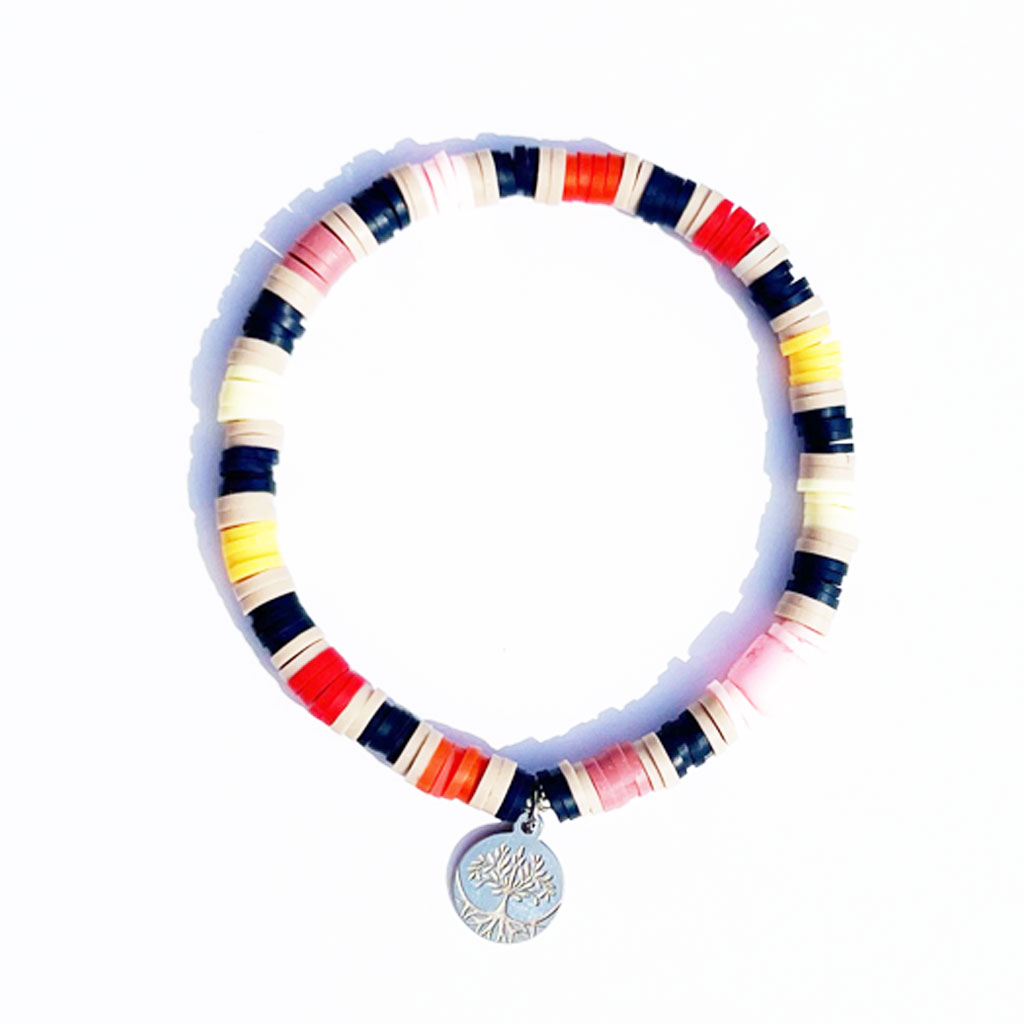 Bracelet élastique, modèle mixte Homme/Femme composé de perles rondelles heishi et d’une plaque « arbre de vie » en acier inoxydable.
